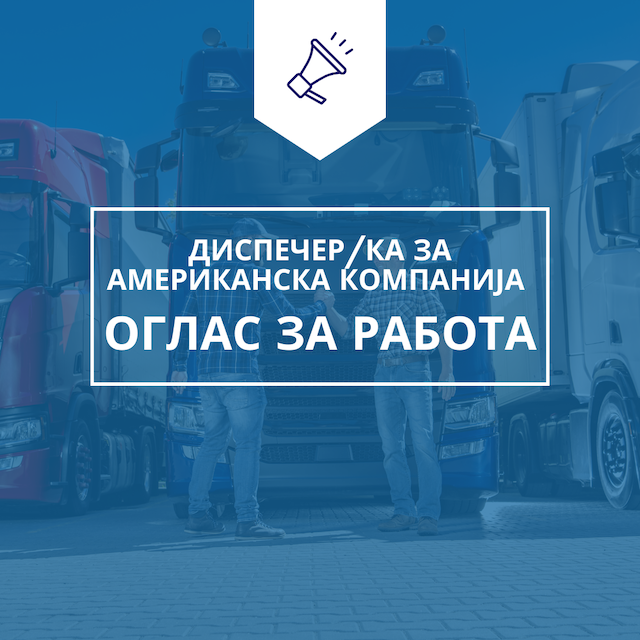 HeadHunting МК во името на својот клиент Компанија од транспортната индустрија, објавува оглас за: Диспечер/ка со задолжително искуство за Dry Van, Flatbed на Американски пазар Полно работно време Потребни квалификации: Претходно работно искуство на иста или слична позиција (задолжително) Напредно ниво на комуникација на англиски јазик Преговарачки вештини Способност за работа во тим Што нуди